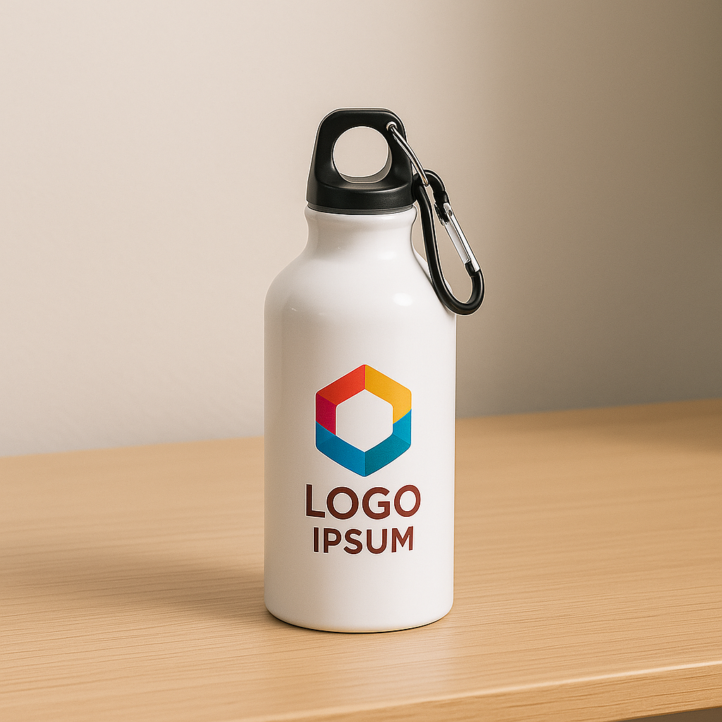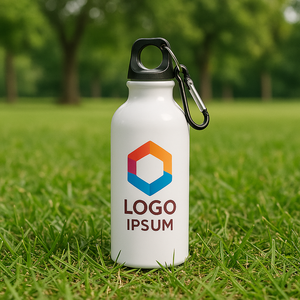 Botella de aluminio blanca con acabado mate, perfecta para personalizar con el logo Impreso de tu empresa, equipo o proyecto.