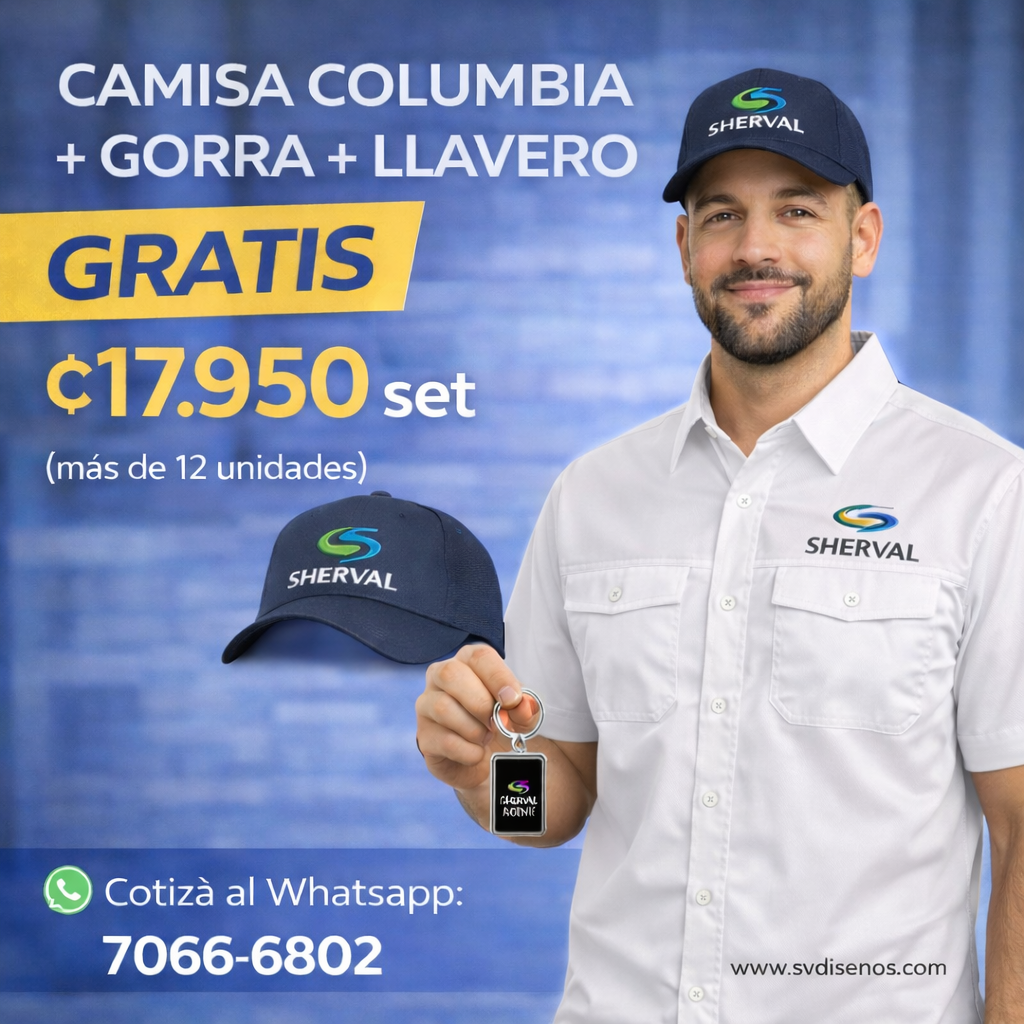 Incluye camisa tipo Columbia manga corta en color blanco, personalizada con el logo de tu empresa, acompañada de gorra corporativa y llavero metálico personalizado como regalía, sin costo adicional.