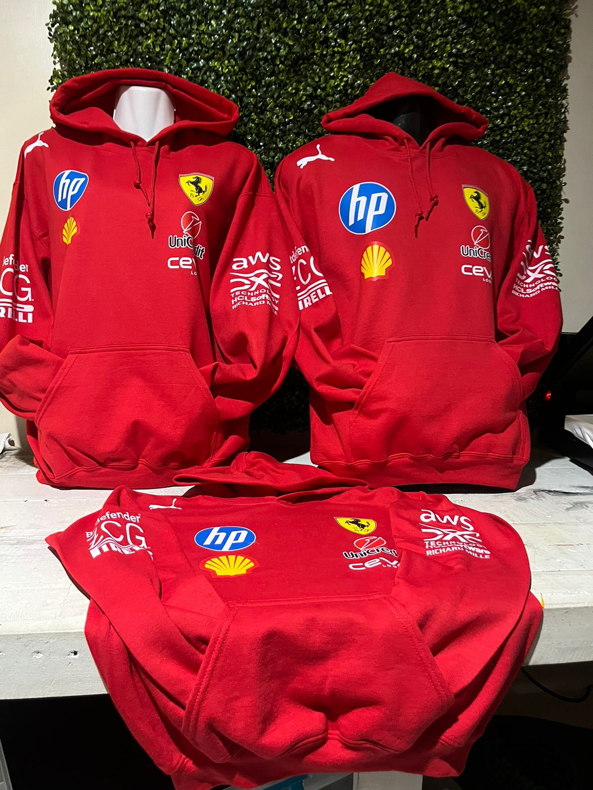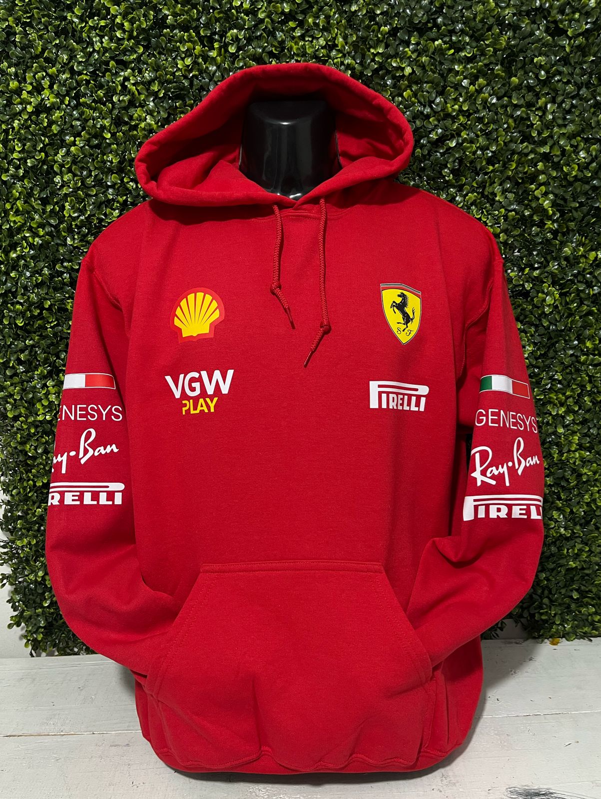 Incluye logos Ferrari, Puma, Shell y patrocinadores del equipo en impresión HD (DTF o vinil premium). Colocación estratégica estilo “uniforme de paddock”, nítido y de larga duración.