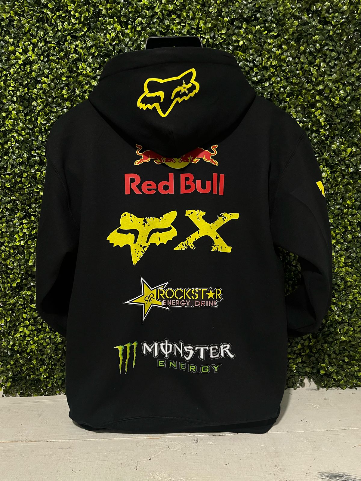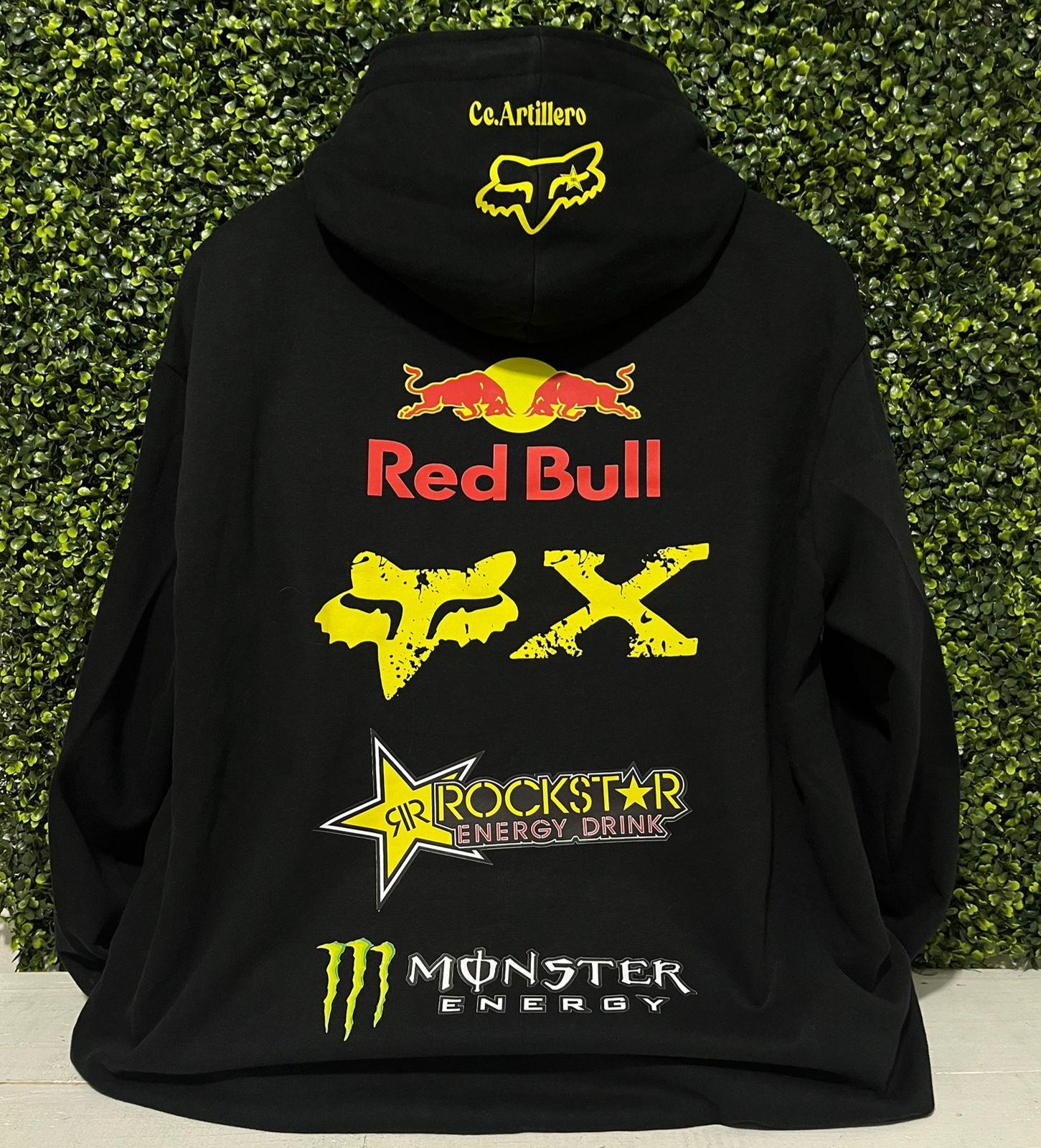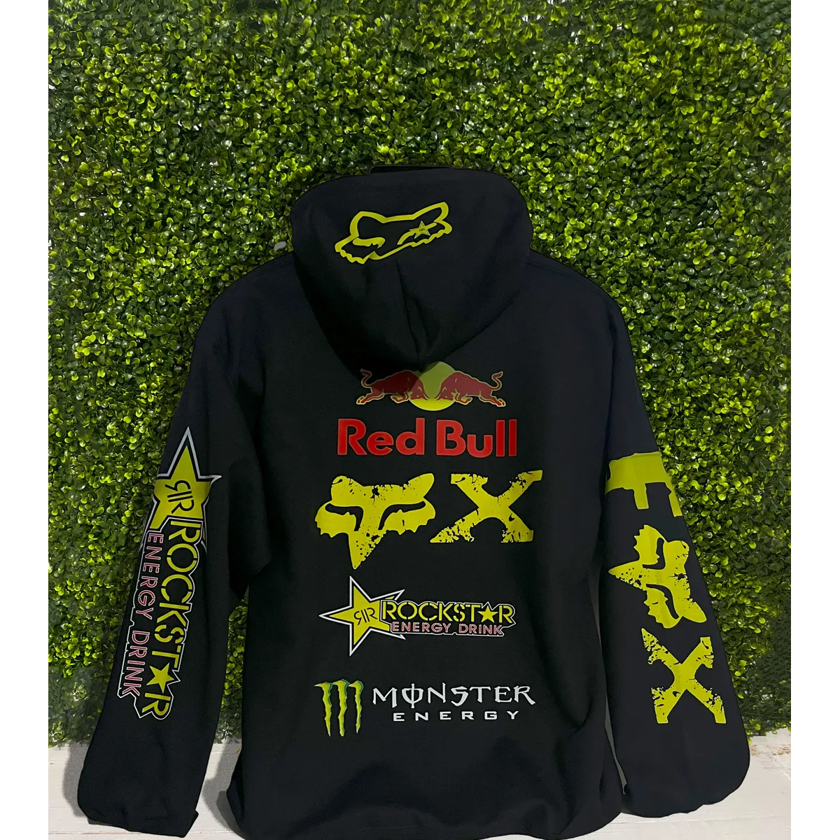 Incluye logos estilo Red Bull, Fox, Rockstar y Monster en alta definición. Arte grande en la espalda y detalles laterales para un look 100% deportivo.
