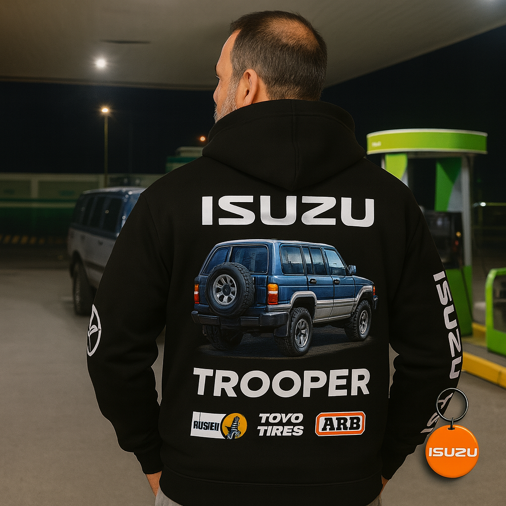 Hoodie personalizada inspirada en el clásico Isuzu Trooper, ideal para amantes del 4x4, coleccionistas y fanáticos del off-road. Diseño premium con acabados nítidos y detalles que destacan la esencia del vehículo.