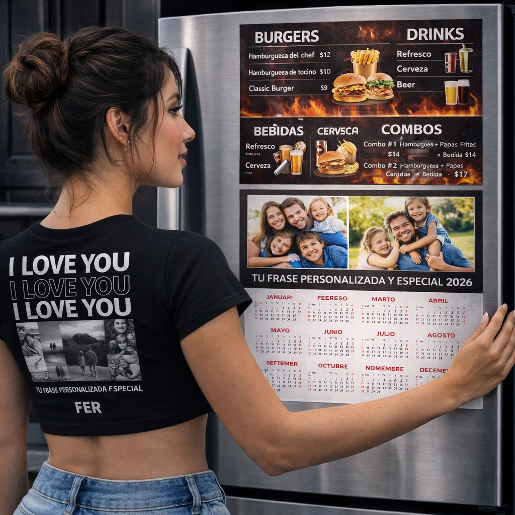 Calendario personalizado tamaño carta, diseñado para colocarse en la refrigeradora. Combina imagen personalizada en la parte superior (collage de fotos o diseño comercial) con calendario completo 2026 en la parte inferior, pensado para uso diario y alta visibilidad.